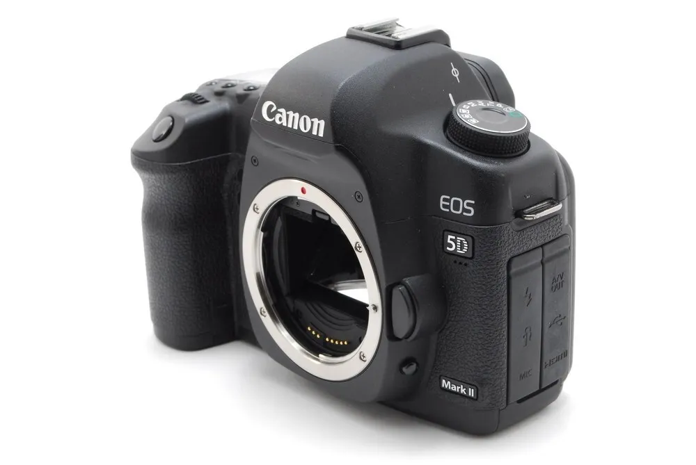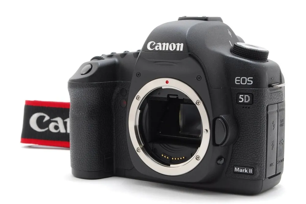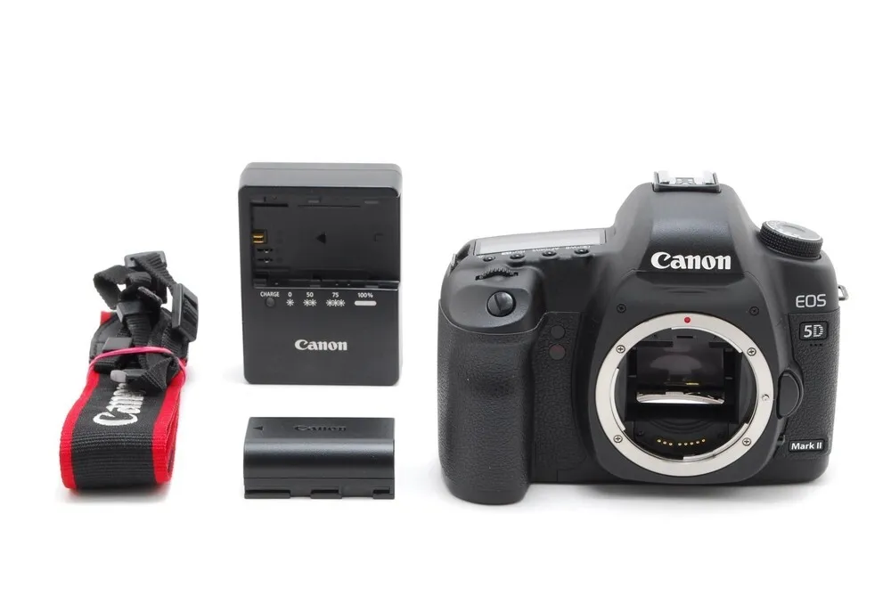 The Canon EOS 5D Mark II is a full-frame digital SLR camera introduced by Canon in 2008. It features a 21.1 megapixel CMOS sensor that delivers high-resolution images with excellent detail and low noise performance. The camera is equipped with Canon's DIGIC 4 image processor, enabling faster image processing and improved noise reduction. One of the groundbreaking features of the EOS 5D Mark II is its ability to shoot Full HD 1080p video, marking Canon's entry into professional video recording within a DSLR. The camera's autofocus system includes 9 AF points with 6 assist points, providing accurate focusing in various shooting situations. Additionally, the body offers a large 3.0-inch LCD screen with 920,000 dots for clear image review and menu navigation.