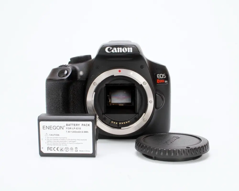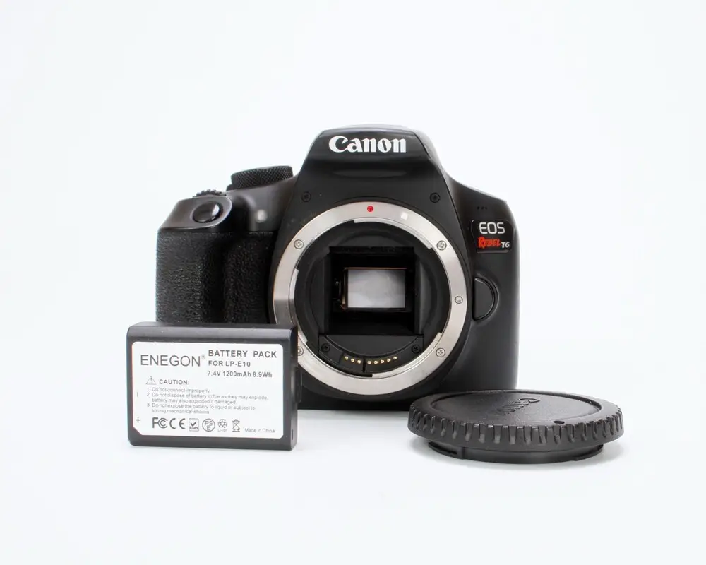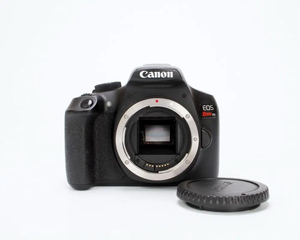 The Canon EOS Rebel T6, also known as the EOS 1300D, is a digital SLR camera introduced in 2016. It features an APS-C sized 18.0-megapixel CMOS sensor that is designed to deliver high-resolution images with rich detail and low noise performance. The camera integrates Canon's DIGIC 4+ image processor, enabling swift image processing and responsive operation. It supports an ISO sensitivity range of 100 to 6400 (expandable to 12800), providing versatility in various lighting conditions. The Rebel T6 is equipped with a 9-point autofocus system for accurate subject tracking and sharp focus. Additionally, it offers Full HD 1080p video recording with manual exposure control, enhancing creative video capabilities.
