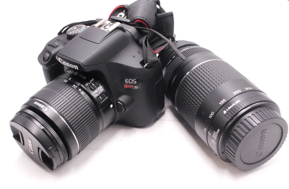 The Canon EOS Rebel T7 is an entry-level DSLR digital camera equipped with a 24.1-megapixel APS-C CMOS sensor, delivering high-resolution images with excellent detail and low noise. It features the DIGIC 4+ image processor, enabling quick image processing and improved performance. The camera supports ISO sensitivity ranging from 100 to 6400, expandable up to 12800, allowing for shooting in various lighting conditions. It offers a 9-point autofocus system for reliable subject tracking and sharp focus capture. The Rebel T7 comes with built-in Wi-Fi and NFC connectivity, facilitating easy sharing and remote control via compatible devices. Paired with the Canon EF 70-300mm lens, the system provides versatile telephoto capabilities suitable for sports, wildlife, and portrait photography.