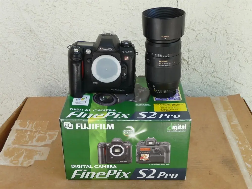 The Fujifilm S2 Pro is a digital single-lens reflex camera released in 2002, built on a Nikon F80 body with Fujifilm's proprietary Super CCD sensor technology. This sensor features 6.17 megapixels with unique angled photodiodes to improve dynamic range and color reproduction. Designed for professional photographers, it offers a 2.5-inch LCD for image preview and menu navigation. The camera supports ISO sensitivity from 200 up to 1600, allowing adaptability in various lighting conditions. It incorporates a TTL phase detection autofocus system and supports interchangeable Nikon F-mount lenses. Equipped with a generous buffer memory and continuous shooting mode, it targets high-performance workflows.