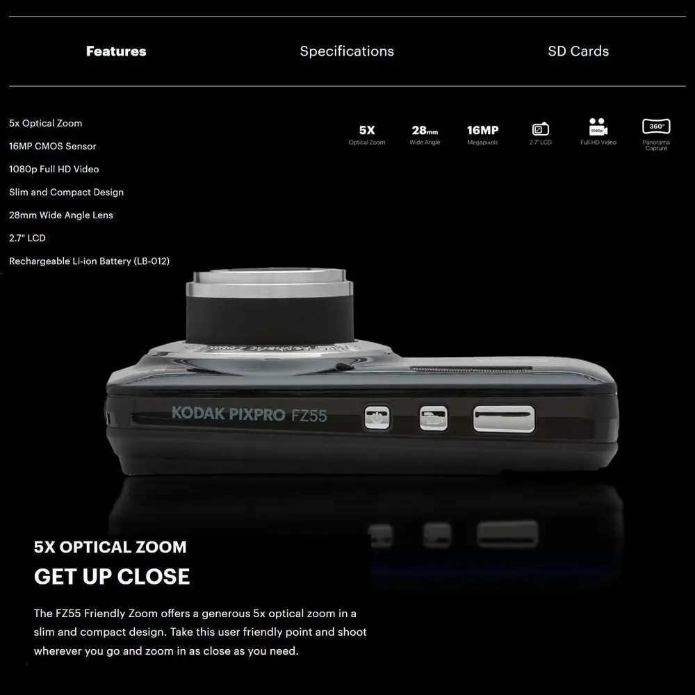 The Kodak Pixpro FZ53BK San20ii stands out with its compact and lightweight design, making it highly portable. Its 14MP sensor ensures quality images suitable for printing and moderate cropping. The 5x optical zoom offers flexibility in framing shots from different distances. Image stabilization aids in producing clearer photos under various conditions. The camera supports HD video capture, adding multi-functionality for users interested in video. Its affordability and user-friendly interface make it accessible for new photographers.
