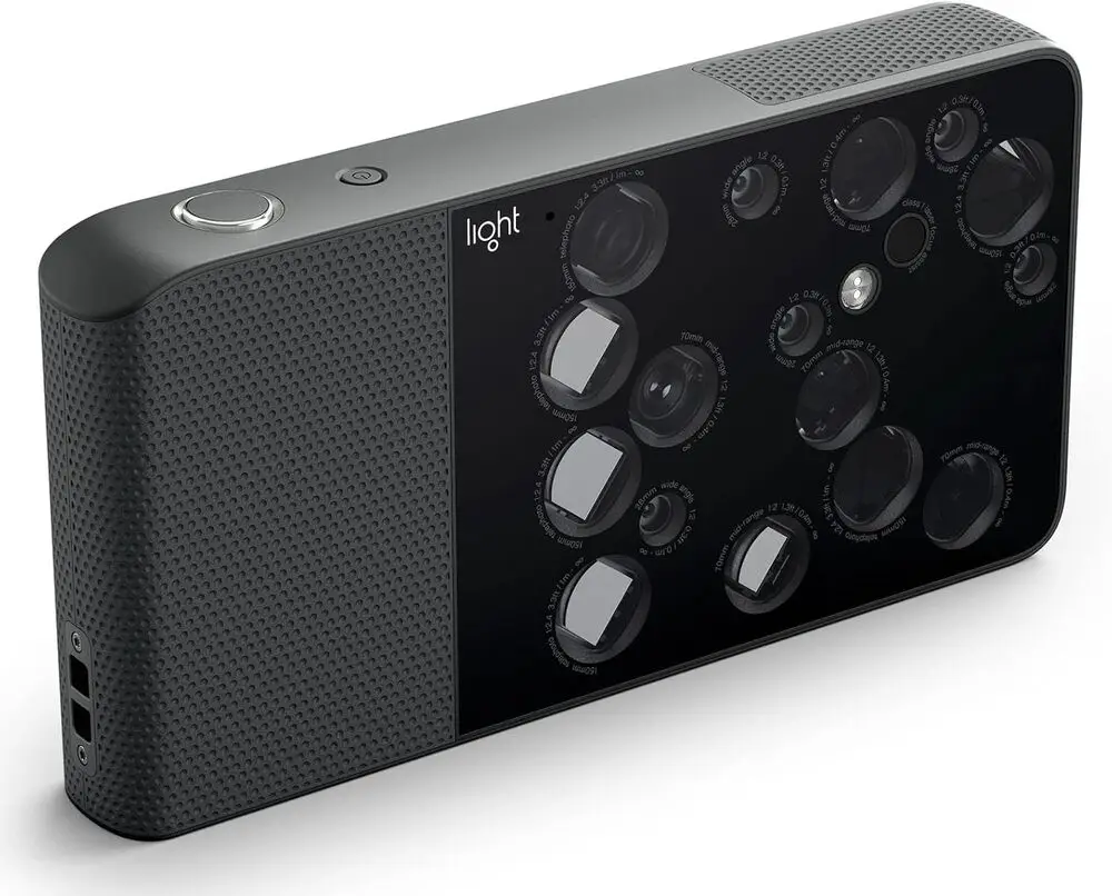 The Light L16 is a high-tech compact digital camera released in 2015 that employs an innovative array of 16 individual camera modules, each with a fixed focal length lens ranging from 28mm to 150mm equivalent. These modules work together using computational photography algorithms to generate a single high-resolution image up to 52 megapixels. The camera uses both RGB and monochrome sensors to enhance detail and dynamic range. It uses advanced image fusion techniques that combine images from multiple lenses and sensors to improve depth of field and reduce noise. The L16 runs on a dedicated Snapdragon processor optimized for image computation and offers connectivity via Wi-Fi and Bluetooth. Its hybrid optical-electronic shutter allows for versatile exposure control in a compact form factor.