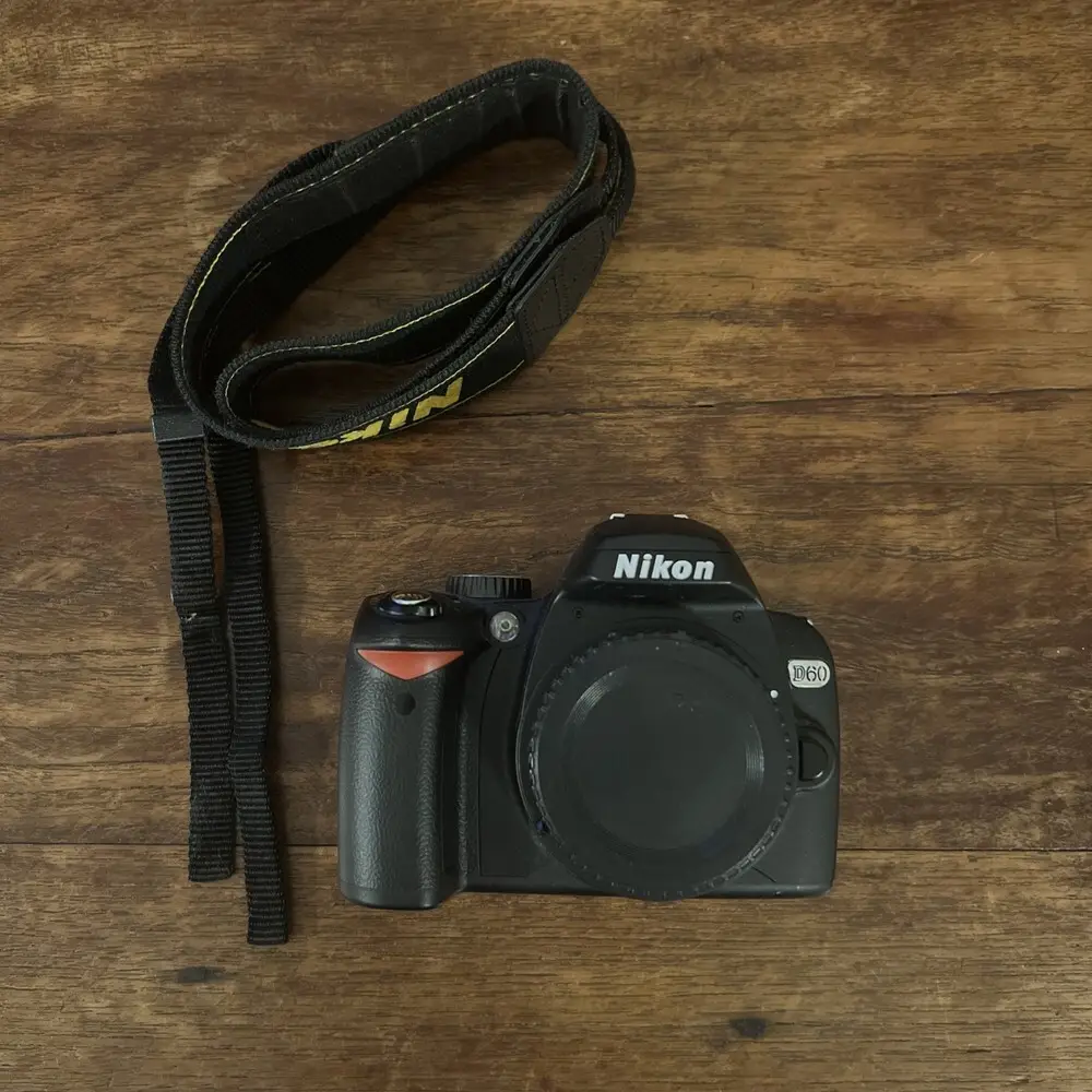 The Nikon D60 is a 10.2-megapixel entry-level DSLR camera released in 2008, designed to offer ease of use combined with DSLR image quality. It is equipped with a DX-format CMOS sensor providing high-resolution images and improved low-light performance. The camera features a 3-point autofocus system and employs Nikon's EXPEED image processor for faster processing speeds and enhanced image quality. The LCD screen measures 2.7 inches with a 230,000-dot resolution, aiding in image review and menu navigation. The D60 supports ISO sensitivity ranging from 100 to 1600, extendable to 3200, enhancing performance in various lighting conditions. It also offers a shutter speed range from 30 seconds to 1/4000 seconds and supports continuous shooting at 3 frames per second.