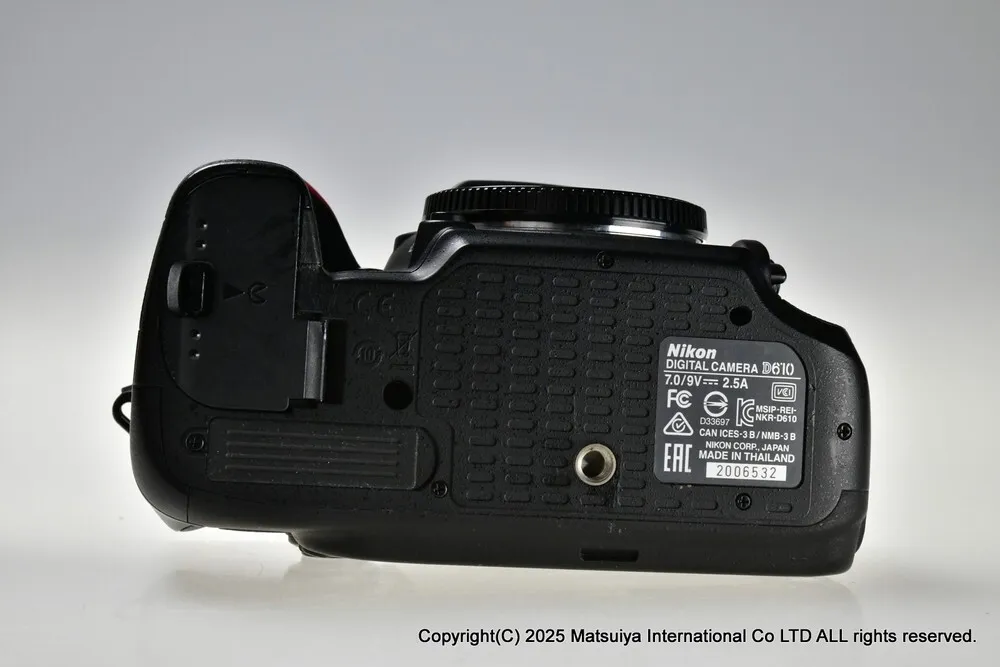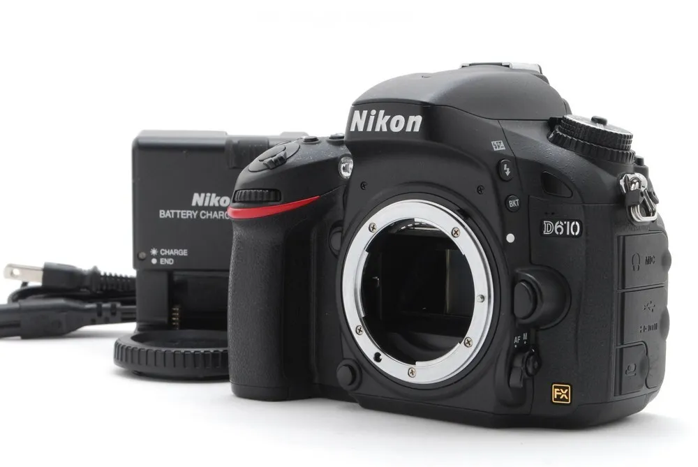 The Nikon D610 is a full-frame DSLR camera released in 2013, featuring a 24.3MP FX-format CMOS sensor that delivers high-resolution imaging with excellent dynamic range and low noise. It is powered by the EXPEED 3 image processor, enabling fast performance and advanced noise reduction capabilities. The camera has a 39-point autofocus system for accurate subject tracking and sharp focus across various conditions. It supports continuous shooting up to 6 frames per second, suitable for action photography. The D610 offers Full HD 1080p video recording with multiple frame rates and provides manual exposure control for filmmakers. Connectivity options include USB 2.0, HDMI output, and optional external GPS compatibility.