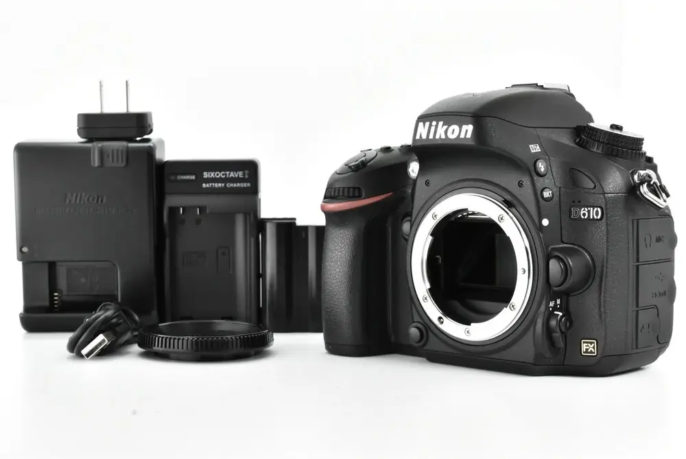 The Nikon D610 is a full-frame DSLR camera featuring a 24.3-megapixel FX-format CMOS sensor designed to capture high-resolution images with excellent detail and low noise. It uses the EXPEED 3 image processing engine for fast image processing and improved ISO performance between 100-6400 expandable up to 25600. The camera boasts a 39-point autofocus system with 9 cross-type sensors for precise focusing accuracy in various lighting conditions. Its shutter mechanism supports a speed range from 30 to 1/4000 seconds with a maximum continuous shooting speed of 6 frames per second. The D610 incorporates a built-in HDR mode along with active D-Lighting for enhanced dynamic range and image quality. Video recording capabilities include Full HD 1080p at 30fps with manual exposure control, making it suitable for both photography and videography professionals.
