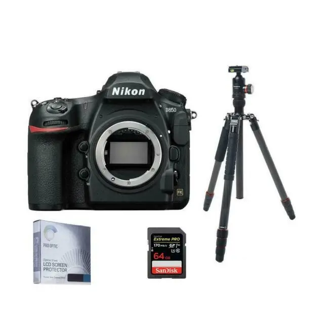 The Nikon D850 is a professional-grade full-frame digital DSLR camera known for its high-resolution 45.7-megapixel BSI CMOS sensor, delivering exceptional image quality and detail. It features an EXPEED 5 image processor that enables high-speed processing for continuous shooting at up to 7 frames per second, extendable to 9 fps with additional battery grip. The camera incorporates a 153-point autofocus system with 99 cross-type sensors, offering precise and fast focusing performance even in challenging conditions. 4K UHD video recording capabilities at 30fps and 1080p slow-motion capture add versatile multimedia options. The rugged magnesium alloy body is weather-sealed to withstand professional use in demanding environments. Additionally, the camera supports a wide ISO range from 64 to 25,600, expandable up to 102,400, providing outstanding low-light performance.