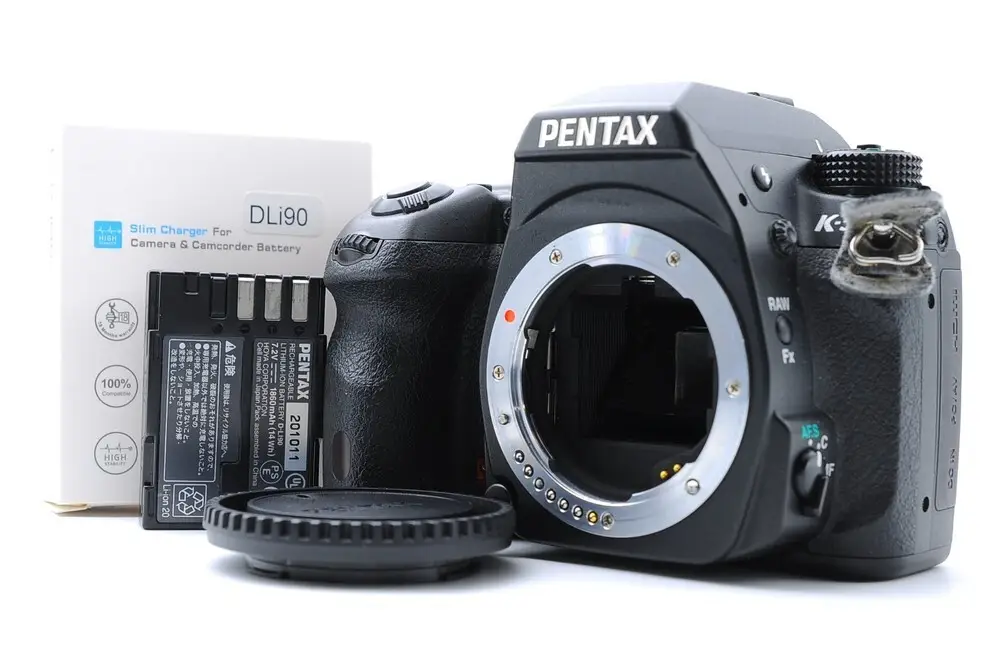 The Pentax K-5 is a high-performance digital SLR camera released in 2010, featuring a 16.3-megapixel APS-C CMOS sensor that delivers sharp and detailed images. It supports ISO sensitivity from 100 to 12800, expandable up to 51200 for low-light conditions. The camera uses the PRIME II image processor enabling fast operation and high image quality. The K-5 includes a 77-point autofocus system with intelligent scene recognition for improved focusing accuracy. It offers continuous shooting at up to 7 frames per second suitable for action photography. The camera supports full HD 1080p video recording with multiple frame rates, integrated image stabilization, and weather-sealed magnesium alloy body construction for durability in various environments.
