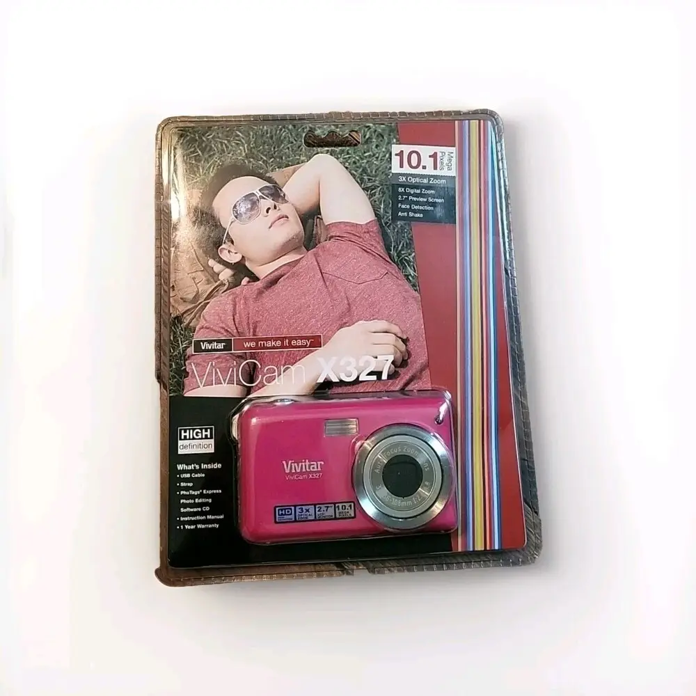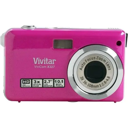 The Vivitar Vivicam X327 (model VX327-PINK) is a compact digital camera featuring a CCD sensor capable of capturing images at a resolution up to 7.1 megapixels. It is equipped with a fixed focal length lens with 3x optical zoom, enabling moderate telephoto capabilities. The camera supports a variety of image formats including JPEG for still images and AVI for video recordings at VGA resolution. It has a 2.4-inch TFT LCD display for image preview and menu navigation.
