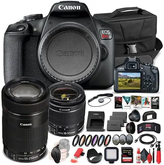 Built-In Media | Canon EOS Rebel T7 DSLR Camera with 18-55mm Lens, Canon EF-S 55-250mm f/4-5.6 IS STM Lens, SanDisk SecureDigital 64GB Extreme PRO Memory Card, Camera Bag, Corel Photo Software With PhotoMirage, AfterShot, Painter Essentials, PaintShop Pro, and Video Studio, 2 x LPE10 Battery, Memory Card Reader, Mini Portable LED Video Light, 3 Piece Pro Filter Kit UV/CPL/F 58MM, Wide Angle Lens 58MM, Telephoto Lens 58MM, 58mm Graduated Color Filter Kit, 58MM Tulip Lens Hood, Micro HDMI Cable, 6AVE Electronics TM Cleaning Set, 12 Inch Flexible Tripod, Hand Strap, Lens Cap Keeper, and Memory Card Wallet. |