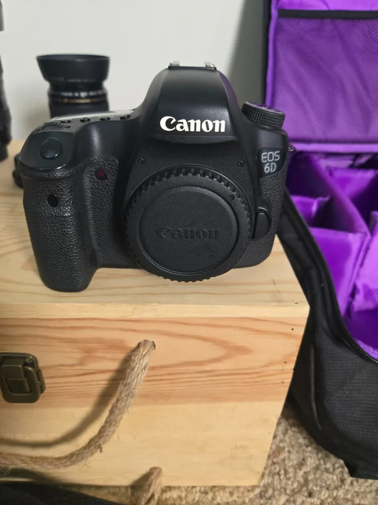 The Canon EOS 6D is a full-frame DSLR camera released in 2012, designed to offer professional-grade imaging performance in a relatively compact and lightweight body. It features a 20.2 megapixel full-frame CMOS sensor coupled with Canon's DIGIC 5+ image processor, enhancing low-light performance and image quality. The camera provides a native ISO range of 100 to 25600, expandable for even greater sensitivity in challenging lighting. It includes an 11-point autofocus system with a center cross-type point, facilitating accurate focusing. The EOS 6D supports Full HD 1080p video recording at multiple frame rates, and built-in Wi-Fi and GPS functionalities improve connectivity and geotagging capabilities. This model utilizes Canon EF-mount lenses, allowing compatibility with a wide range of professional lenses for diverse photographic needs.