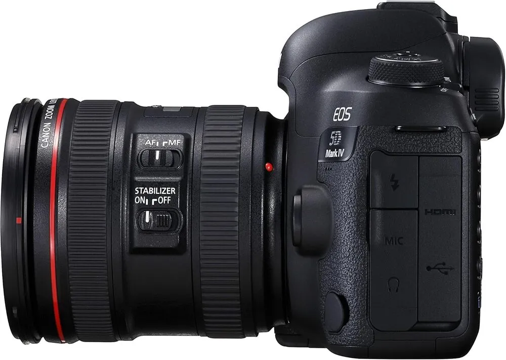 The Canon EOS 5D Mark IV features a full-frame CMOS sensor measuring approximately 36 x 24 mm.