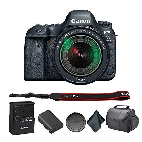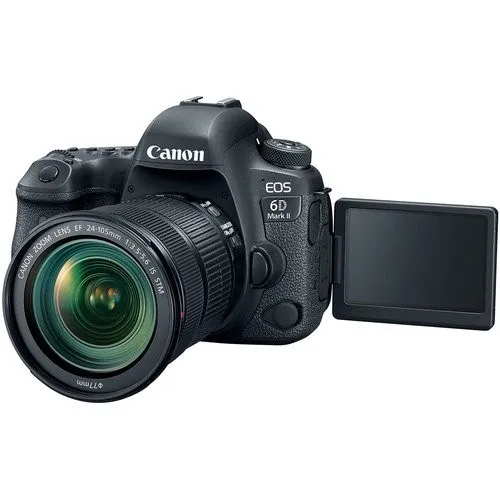 The Canon EOS 6D Mark II is a full-frame DSLR camera introduced in 2017, offering advanced photographic capabilities primarily for enthusiast and professional photographers. It features a 26.2-megapixel Full-Frame CMOS sensor combined with the DIGIC 7 image processor, delivering high-resolution images with excellent noise reduction across a wide ISO range of 100-40000 (expandable to 50-102400). The camera incorporates a 45-point all-cross-type autofocus system for precise subject tracking, enhanced by Dual Pixel CMOS AF technology for smooth and accurate autofocus during live view and video recording. It supports continuous shooting at up to 6.5 frames per second, making it suitable for capturing dynamic scenes. Video capabilities include Full HD 1080p recording at 60fps, complemented by built-in Wi-Fi, NFC, and Bluetooth connectivity for seamless sharing and remote control. The design emphasizes durability, with weather-sealing for use in various environmental conditions, and a vari-angle touchscreen LCD for flexible shooting angles.