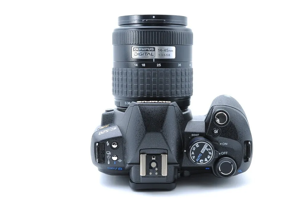 The E-520 includes a vari-angle LCD screen for flexible shooting angles and Live View functionality using contrast-detection autofocus.