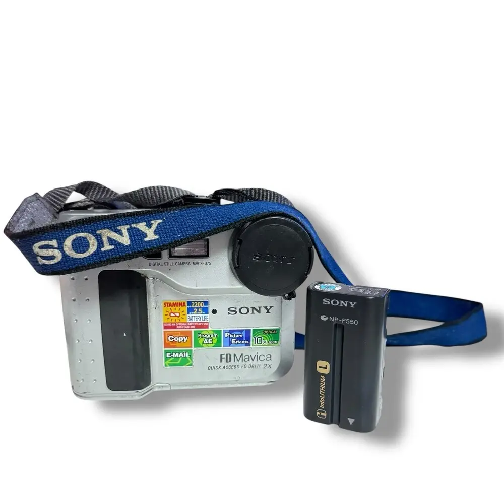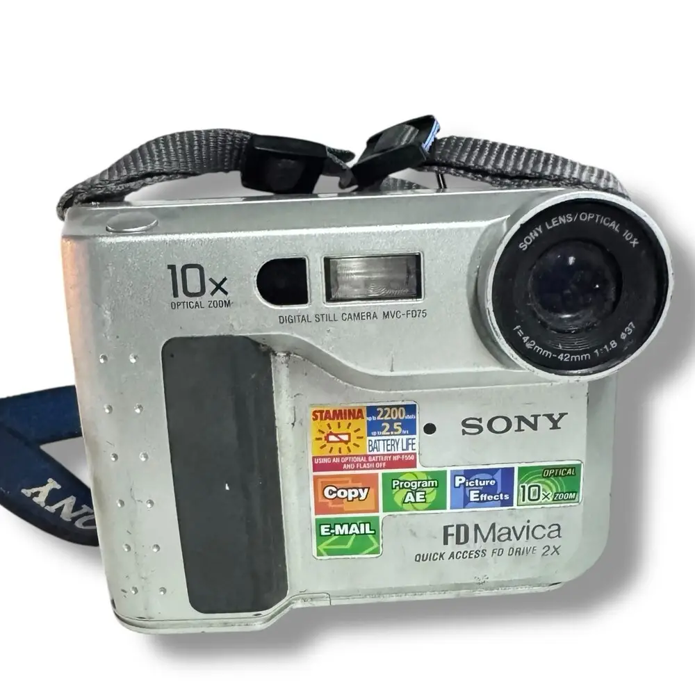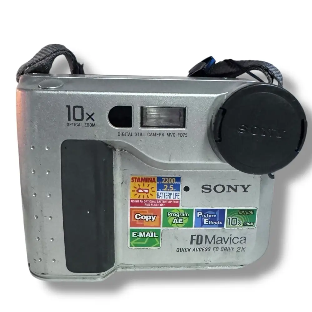 The Sony MVC-FD75 Mavica is a digital camera introduced in 1999 belonging to the Mavica series. It features a 2.3-megapixel CCD sensor capturing images with a maximum resolution of 1800 x 1200 pixels. The camera uses 3.5-inch floppy disks as storage media, allowing easy transfer of images to computers. The lens system is a 38mm f/2.8 fixed lens, equipped with a macro mode for close-up shots. The camera supports several exposure modes, including Program AE and manual adjustments. It offers an electronic viewfinder and a 1.8-inch LCD monitor for framing and reviewing images.