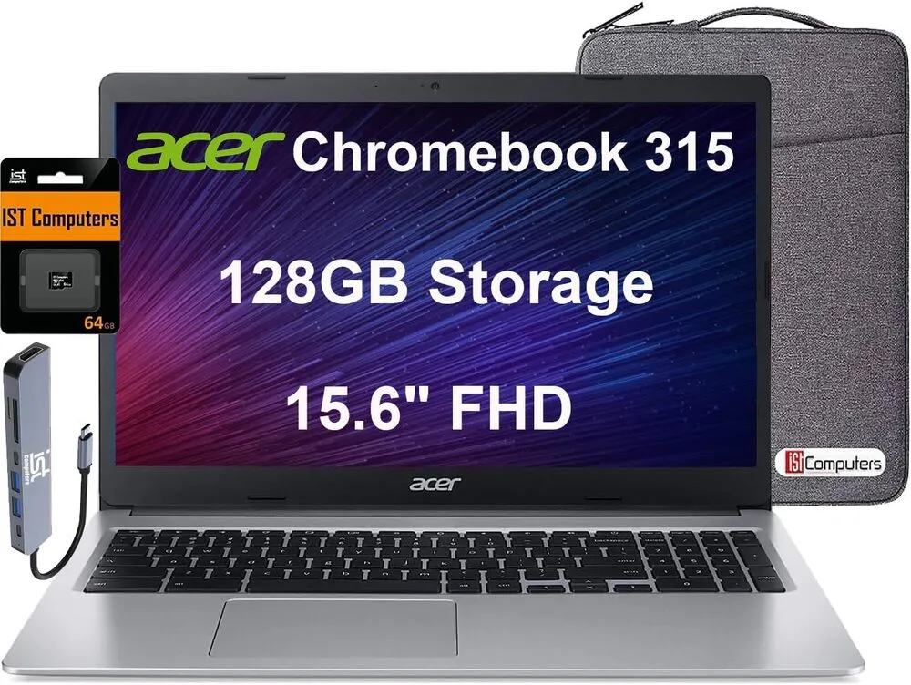 The Acer Chromebook 315 boasts a large 15.6-inch Full HD IPS display, enhancing user experience with vibrant colors and wide viewing angles. Its fanless design means silent operation, which is ideal for quiet environments like libraries or classrooms. The device features multiple USB-C ports that support charging and data transfers, adding versatility for various peripherals. Long battery life up to 10 hours permits extended use without frequent recharging, boosting productivity on the go. Chrome OS is lightweight and fast, receiving automatic updates that keep the system secure without user intervention. Additionally, expandable storage via microSD card slots allows users to increase capacity conveniently.