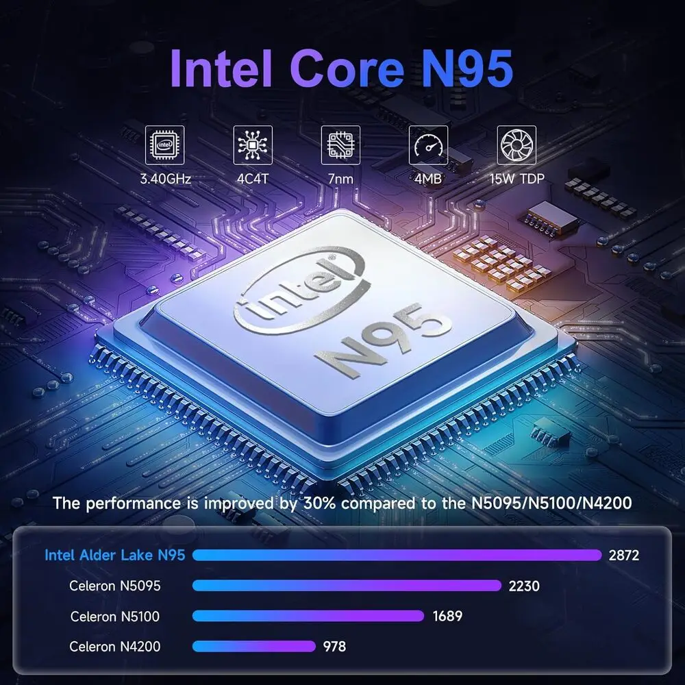 The Akocrsiy N95 model typically features entry-level Intel or AMD processors designed for low power consumption and basic computing tasks.
