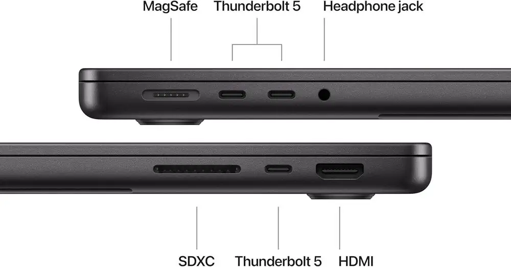It includes Thunderbolt, USB 3.0, HDMI, and a MagSafe 2 power connector.