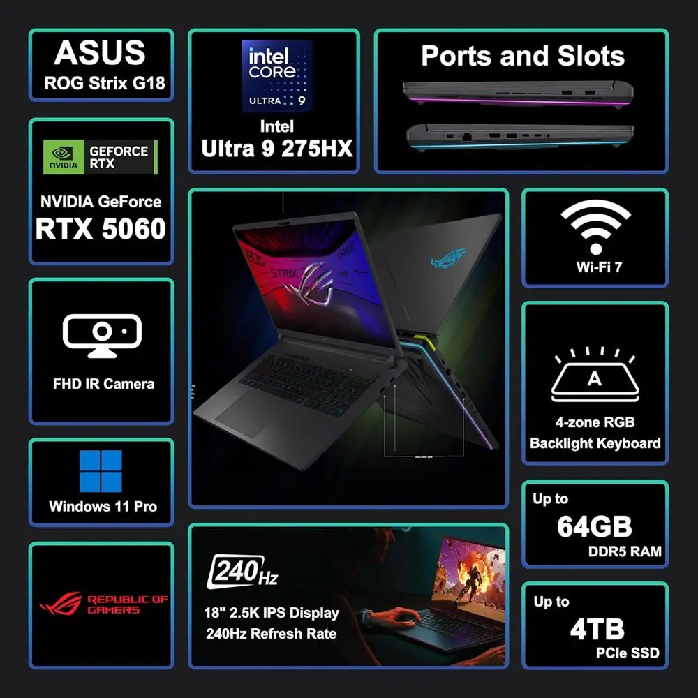 The ASUS ROG Strix G18 G815 boasts an ultra-fast 360Hz IPS display delivering buttery smooth visuals essential for competitive gaming. Its cutting-edge Intel Core i9 processor alongside NVIDIA RTX 4080 GPU guarantees top-tier gaming and creative work performance. The incorporation of DDR5 RAM and PCIe 4.0 SSDs ensures highest data throughput and responsive multitasking. Superior cooling technology maintains optimal thermals even during extended gaming sessions, preventing thermal throttling. Versatile port selection including Thunderbolt 4 and HDMI 2.1 supports multiple high-resolution external displays and peripherals. The RGB per-key customizable keyboard enhances user personalization alongside improved tactile feedback.
