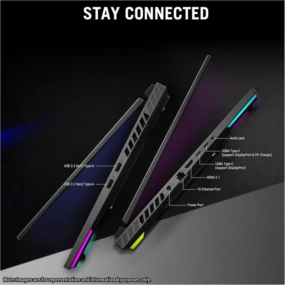 The ASUS ROG Strix G16-10 offers Wi-Fi 6E, Bluetooth 5.2, multiple USB-C and USB-A ports, and an HDMI output for versatile connectivity.