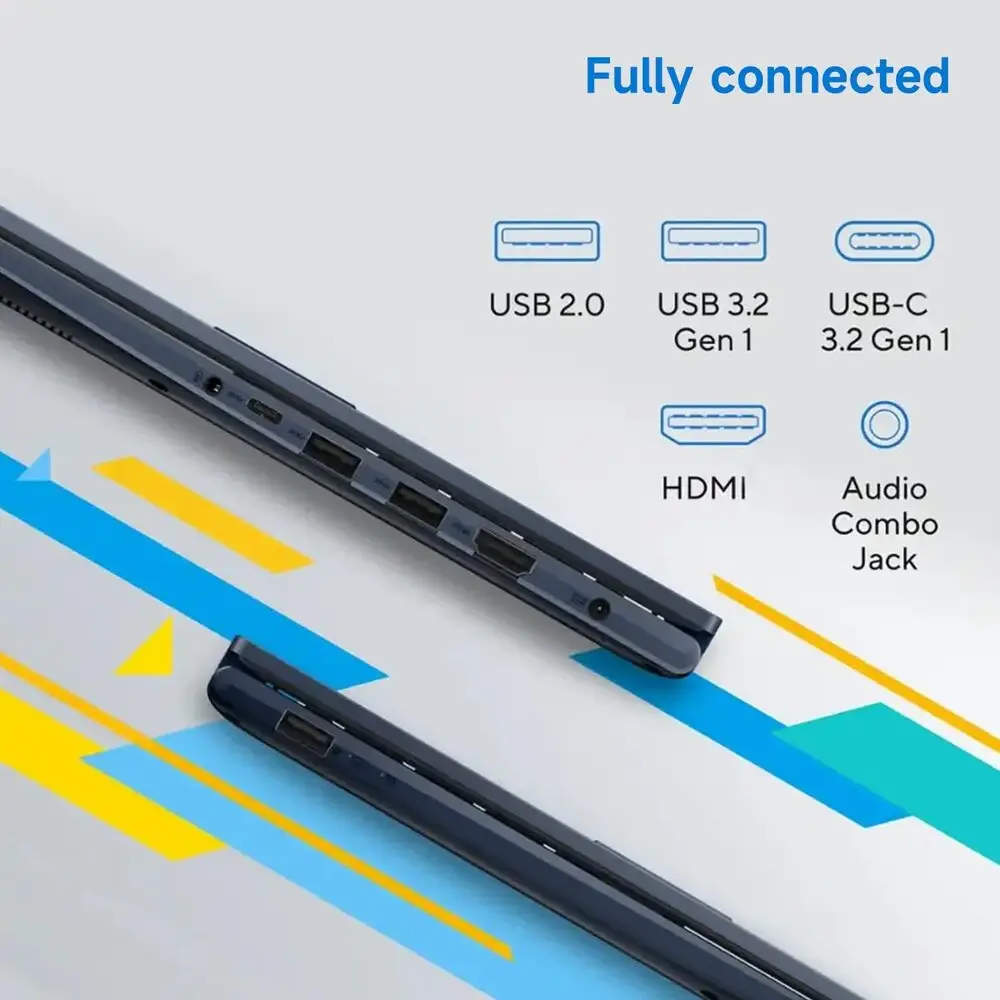 Equipped with 8GB DDR4 RAM and a 256GB NVMe SSD, the system offers fast data access and multitasking capabilities. The chassis is engineered with a durable plastic build to maintain light weight while ensuring resilience. Connectivity options include Wi-Fi 6, Bluetooth 5.0, USB Type-A and Type-C ports, HDMI output, and a headphone jack, allowing versatile peripheral integration.