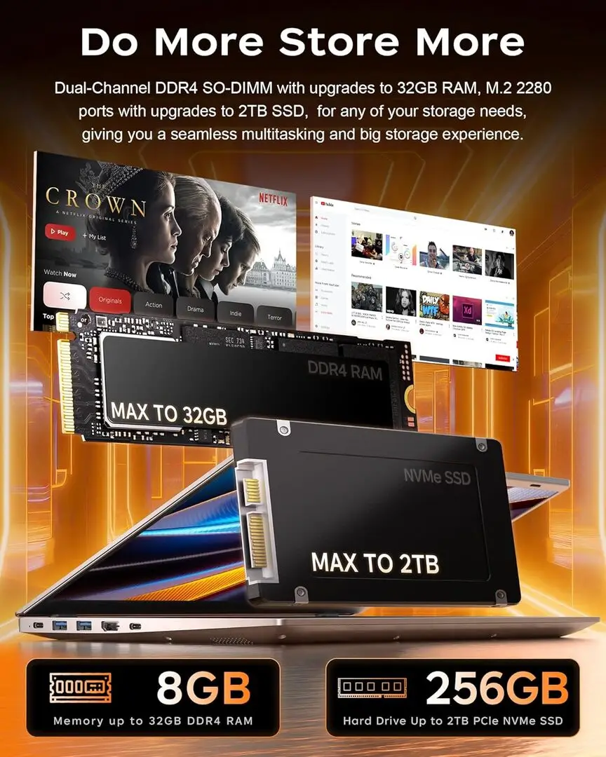 The laptop supports traditional HDD and some versions may support SSD storage to improve speed and performance.
