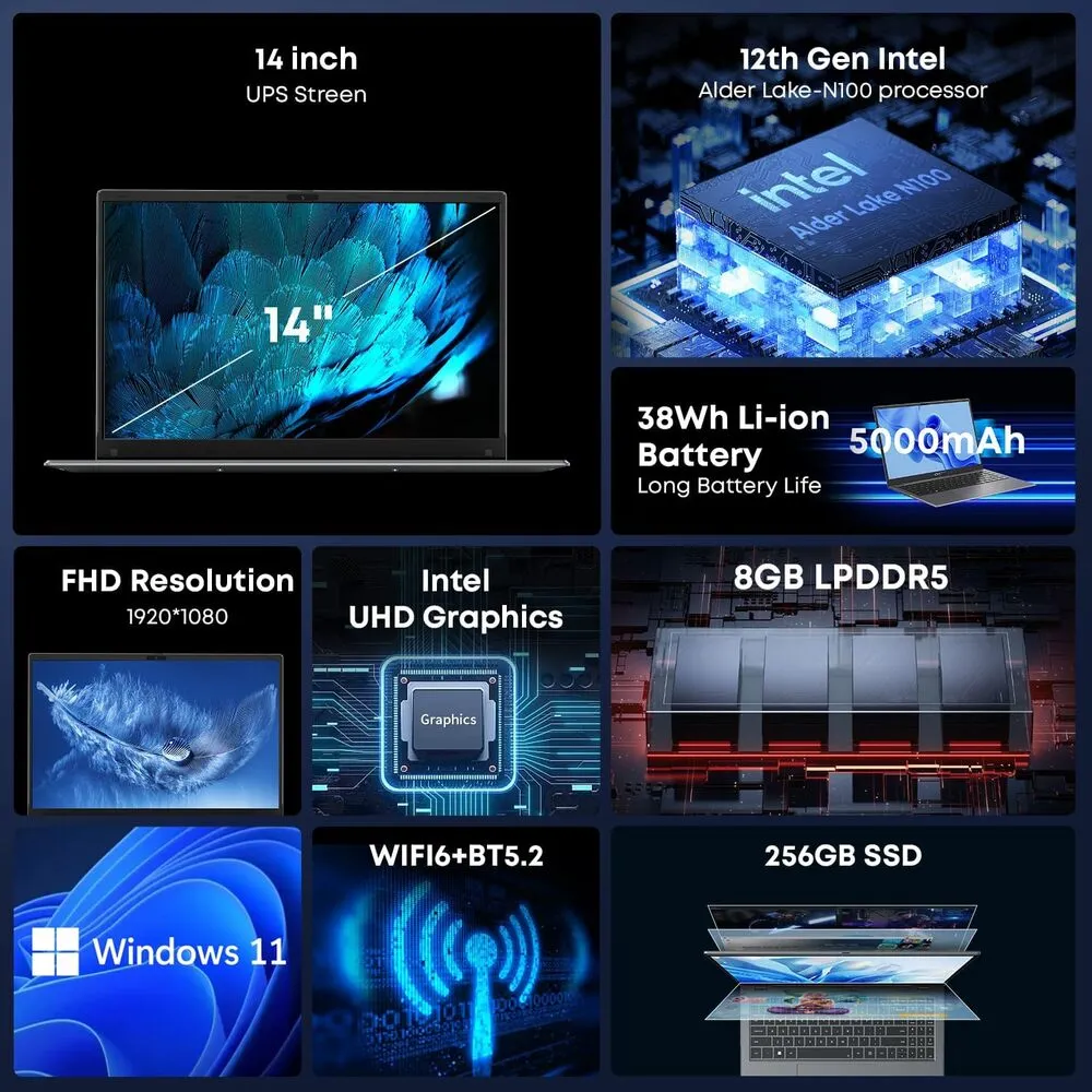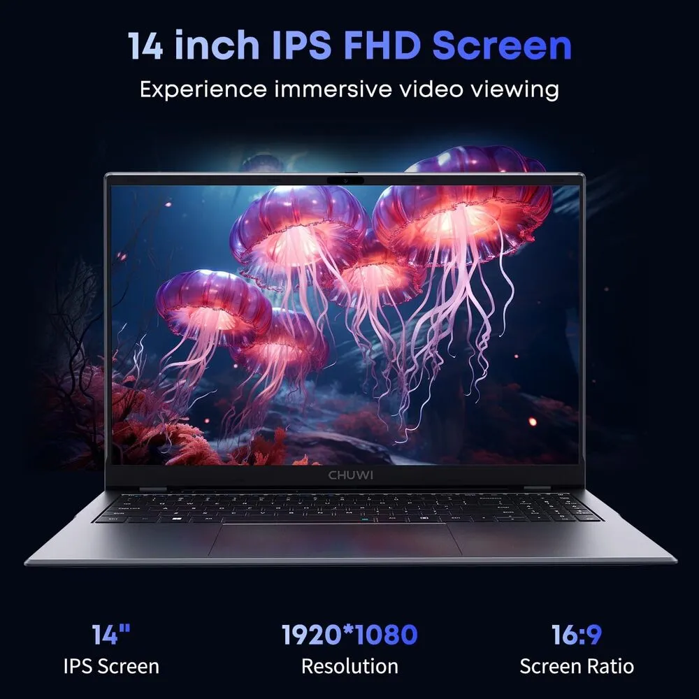 The CHUWI Gemibook XPro N100 offers excellent portability thanks to its lightweight design. Its Full HD IPS display provides sharp and vibrant images with wide viewing angles. The inclusion of the Intel Celeron N4100 processor combined with 8GB RAM allows satisfactory performance for everyday tasks. Storage with a 256GB SSD not only speeds up system responsiveness but also provides decent capacity for most users. The aluminum build increases durability and gives the device a premium feel. Additionally, the laptop offers a variety of ports and wireless connectivity options enhancing its versatility.