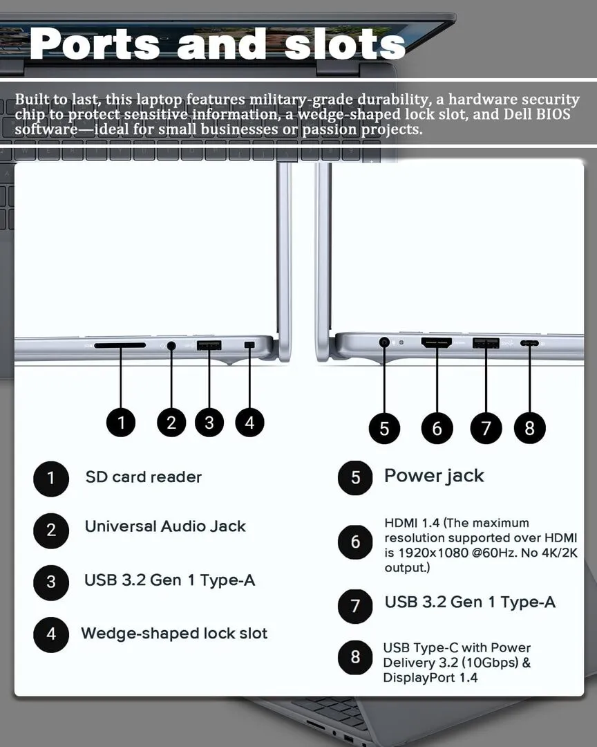 Ports | 1x USB-C 3.2 Gen 2, 2x USB-A 3.2, HDMI 2.0, 3.5mm Universal Audio Jack, SD card reader |