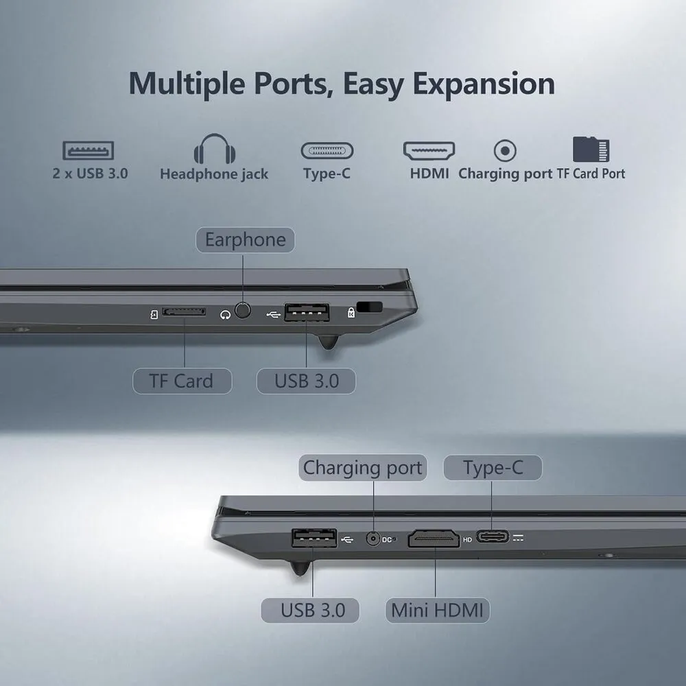 The DUNHOO A2 stands out for its lightweight and slim build, making it a convenient option for users on the go. Its low power processor contributes to an extended battery life, which is advantageous for prolonged usage without frequent recharging. The inclusion of both USB and HDMI ports increases its versatility by supporting various external devices and displays. The cost-effective eMMC storage offers fast data access speeds suitable for its class. Additionally, the laptop has a simple design that favors easy maintenance and repair. It also supports multiple Windows versions, ensuring software compatibility.
