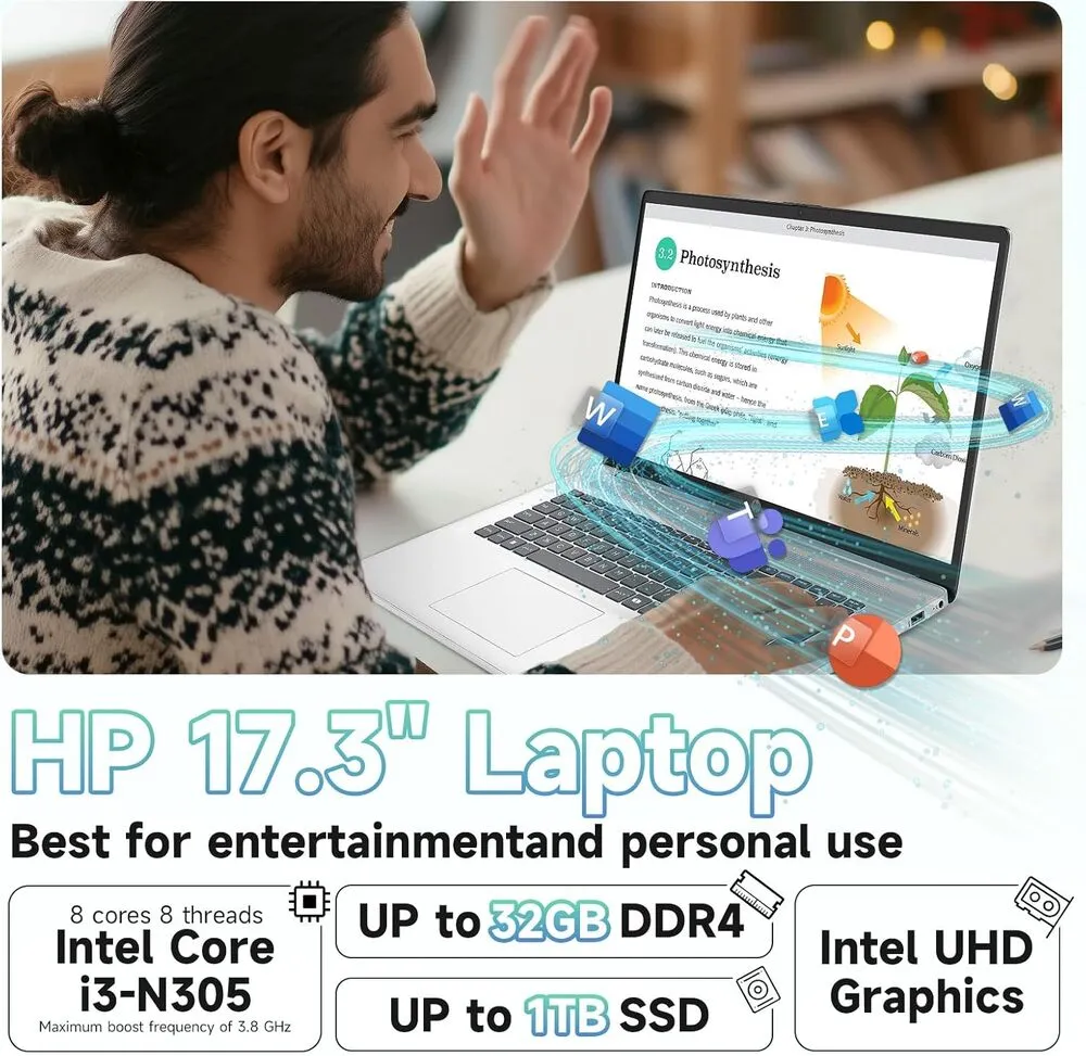 The HP 2025 17.3 Laptop features a large 17.3-inch display, delivering high-definition visuals suitable for multimedia and productivity tasks. It is equipped with next-generation processors providing strong performance for both multitasking and demanding applications. The laptop supports a fast DDR5 RAM configuration and high-capacity SSD storage solutions to ensure quick boot and data access times. Connectivity includes multiple USB 3.2 ports, Thunderbolt 4, HDMI output, and Wi-Fi 6E for enhanced network speeds. The device runs on the latest Windows operating system, offering a user-friendly interface and wide software compatibility. Additionally, it includes integrated graphics and discrete GPU options for advanced graphical workloads.