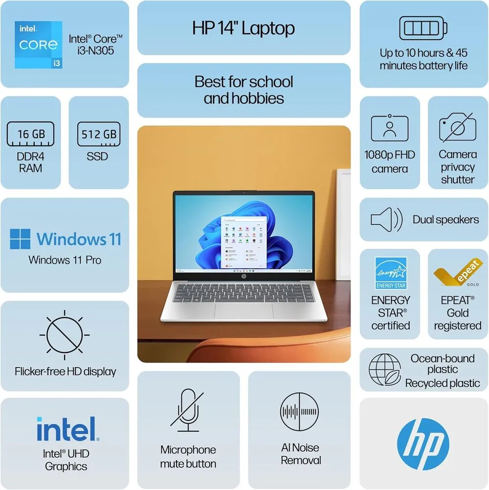 The HP 2025 Newest 14 Inch Laptop features a 14-inch Full HD display with an anti-glare IPS panel providing crisp visuals and wide viewing angles suitable for professional and personal use.