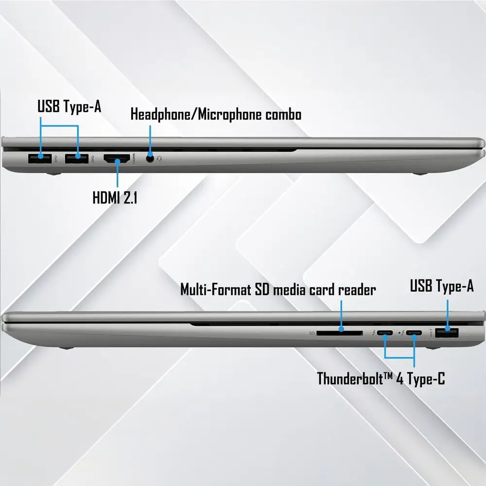 Common ports include USB Type-A, USB Type-C with Thunderbolt on some models, HDMI outputs, SD card reader, and headphone/microphone combo jacks.