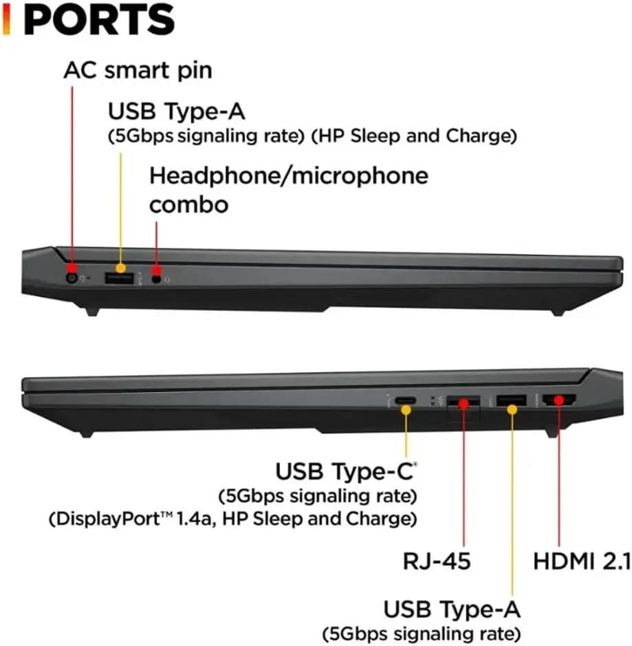 Connectivity includes multiple USB Type-A ports, a USB Type-C port, HDMI output, an Ethernet port, and a headphone/microphone combo jack.