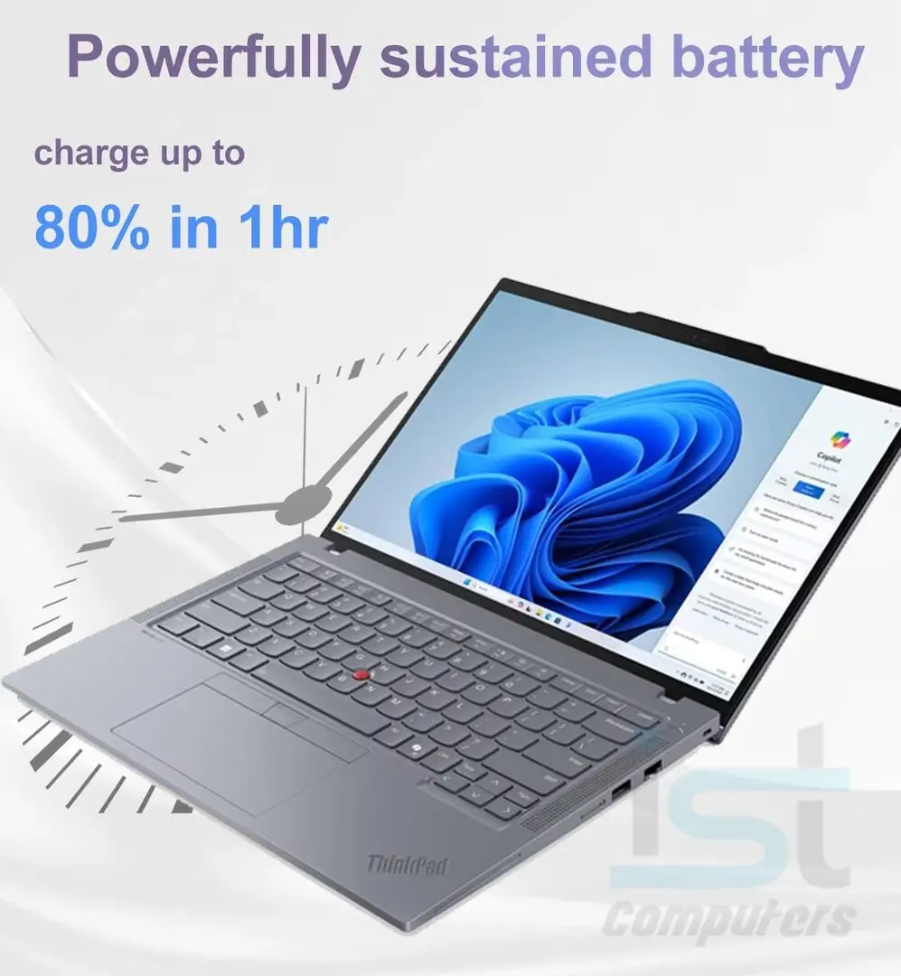 Lenovo has integrated its renowned ThinkShield security suite and improved thermal management technology to ensure stable performance during intensive workloads. The chassis is lightweight and MIL-STD-810H tested for durability, making it suitable for both office and mobile environments. Battery life is extended with rapid charging capabilities, supporting All-day use with approximately 57 Wh battery capacity. Overall, the ThinkPad T14 Gen 5 blends robust performance, security, and portability tailored to professional users.