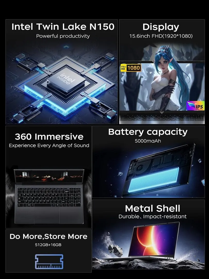 The KAIGERR TX15 AX16 laptop boasts superior processing power with its latest generation Intel CPU, enabling smooth performance for complex tasks. It offers ample 16GB RAM capacity, supporting heavy multitasking and memory-intensive applications. The NVMe SSD significantly reduces load and boot times compared to traditional drives. Its Full HD IPS display ensures vibrant and consistent visuals from multiple angles. Enhanced connectivity features such as Wi-Fi 6 and USB-C support modern networking and peripheral integration. Additionally, the laptop’s design emphasizes durability and portability for users on the move.