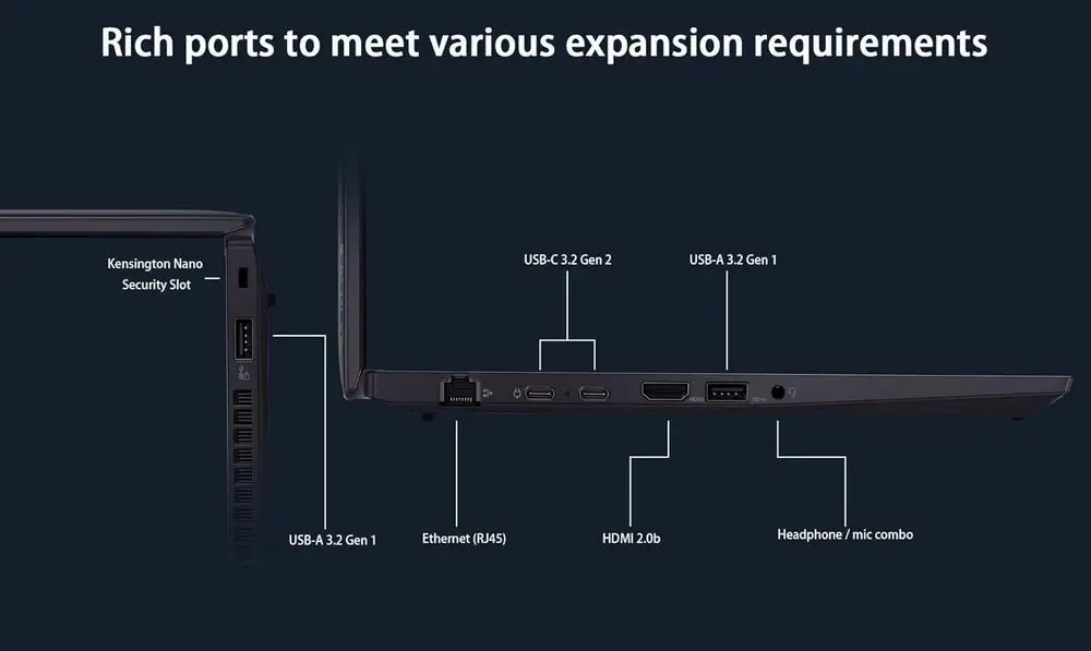 The laptop includes USB ports, VGA output, audio jacks, and an Ethernet port for various connectivity needs.