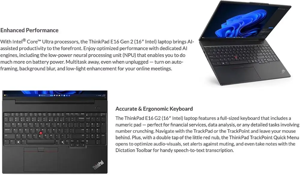 The ThinkPad E16 Gen 2’s relatively large 16-inch size reduces portability compared to smaller ultrabooks, impacting mobility. While equipped with integrated graphics, it lacks a dedicated GPU, limiting its suitability for high-end graphics tasks or gaming. Battery life may vary significantly under heavy workloads, which might require frequent charging during intensive use. The laptop’s weight is moderately higher, which could be a consideration for users prioritizing light devices. Limited availability of touchscreen options restricts interaction versatility. Additionally, the absence of Thunderbolt 4 on certain configurations can limit high-speed peripheral connectivity.