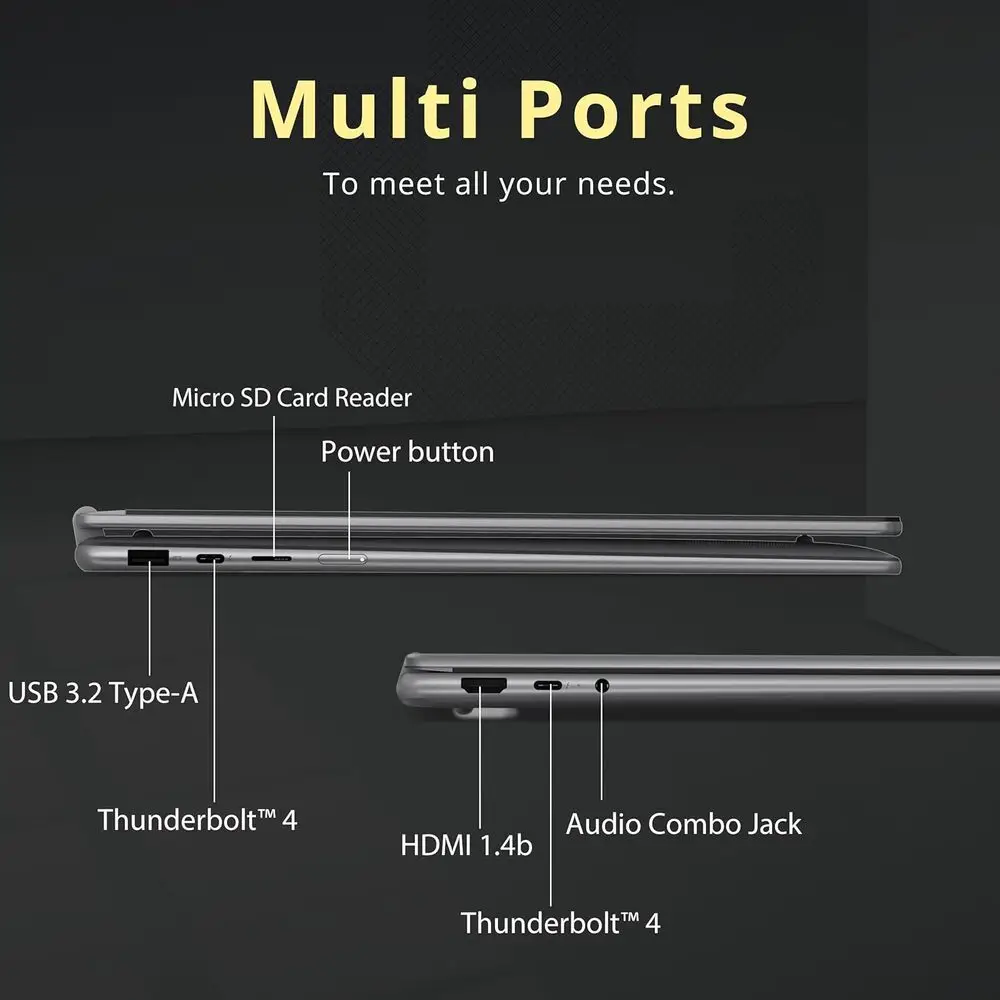 The laptop integrates versatile ports including USB Type-C with Thunderbolt 4 support while maintaining a slim and lightweight chassis optimized for portability.