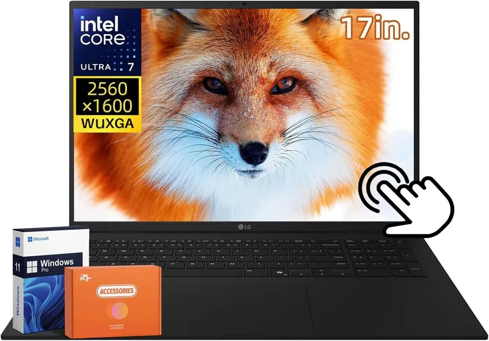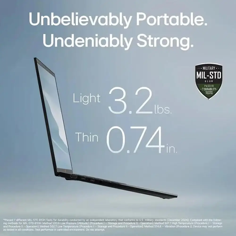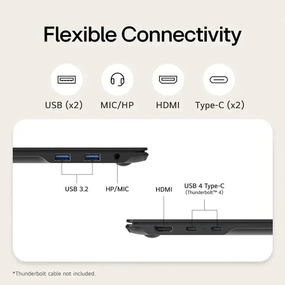 The LG gram 17's primary advantage lies in its large 17-inch display combined with an ultra-lightweight design, making it ideal for users desiring portability without compromising screen real estate. The high-resolution screen with IPS technology provides excellent color accuracy and wide viewing angles. Its long battery life supports extended use without frequent charging. The inclusion of Thunderbolt 3 ensures versatile connectivity with fast data transfer and support for multiple external devices. The laptop's build quality uses a magnesium alloy frame, offering robustness while maintaining a lightweight profile. Additionally, the fast NVMe SSD significantly improves boot times and application loading speeds, enhancing overall system responsiveness.