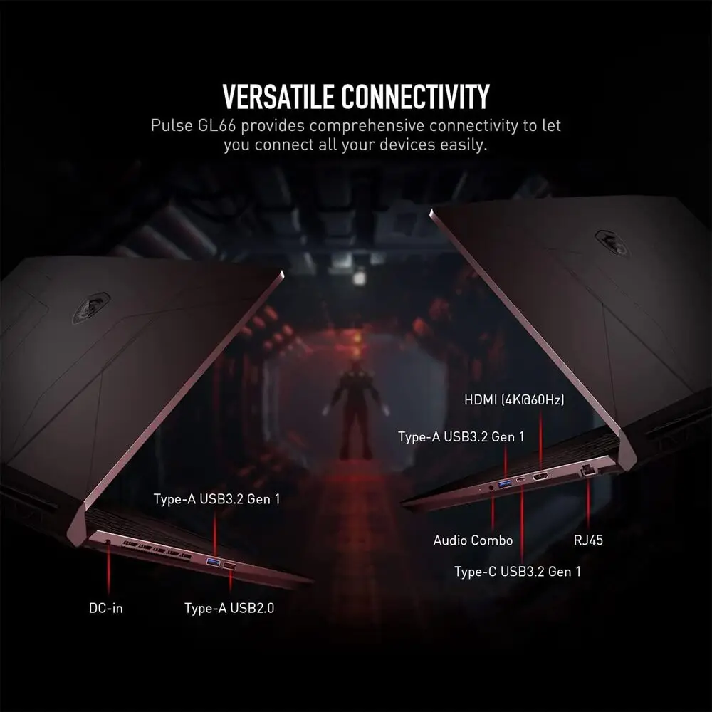 The MSI Pulse GL66 is a high-performance gaming laptop powered by the latest Intel Core i7 processors, delivering strong computational capabilities for intensive applications. It features NVIDIA GeForce RTX series graphics cards, providing real-time ray tracing and AI-enhanced graphics performance. The laptop is equipped with a 15.6-inch FHD IPS display with a 144Hz refresh rate, ensuring smooth visuals and reduced motion blur during gaming or multitasking. Memory configurations typically include up to 32GB DDR4 RAM, enabling efficient multitasking and faster data processing. Storage options comprise fast NVMe SSD drives that offer rapid boot times and quick file access. Connectivity is comprehensive, featuring multiple USB Type-A and Type-C ports, HDMI 2.1 for 4K external display support, Wi-Fi 6 for faster wireless networking, and Gigabit Ethernet for reliable wired connections.