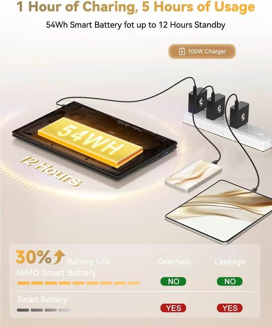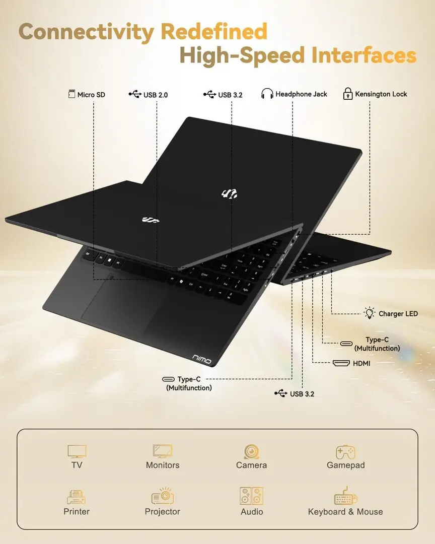 The NIMO N15AL stands out with its reliable build quality and user-friendly keyboard layout, making long typing sessions comfortable. Its 15.6-inch screen size is a versatile balance between portability and visual workspace. The device offers multiple storage expansion options, including support for SSD upgrades, enhancing performance. Battery life is sufficient for typical workday use under moderate workloads. The inclusion of standard connectivity ports allows easy integration with external peripherals. Additionally, its cooling system is adequate to maintain stable operation during extended use periods.