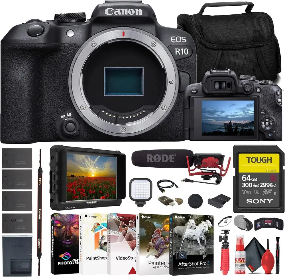 Built-In Media | Canon EOS R10 Mirrorless Camera, Lilliput A7S 7' Full HD Monitor, Rode VideoMic Camera-Mount Shotgun Microphone, Sony 64GB UHS-II U3 TOUGH SD Card, Soft Bag, External Battery Charger, 3 x LPE17 Battery, Memory Card Reader, Led Light, Corel Photo Software, Micro HDMI Cable, 12_inch Flexible Tripod, Hand Strap, Memory Card Wallet, Lens Cap Keeper, Cleaning Kit |