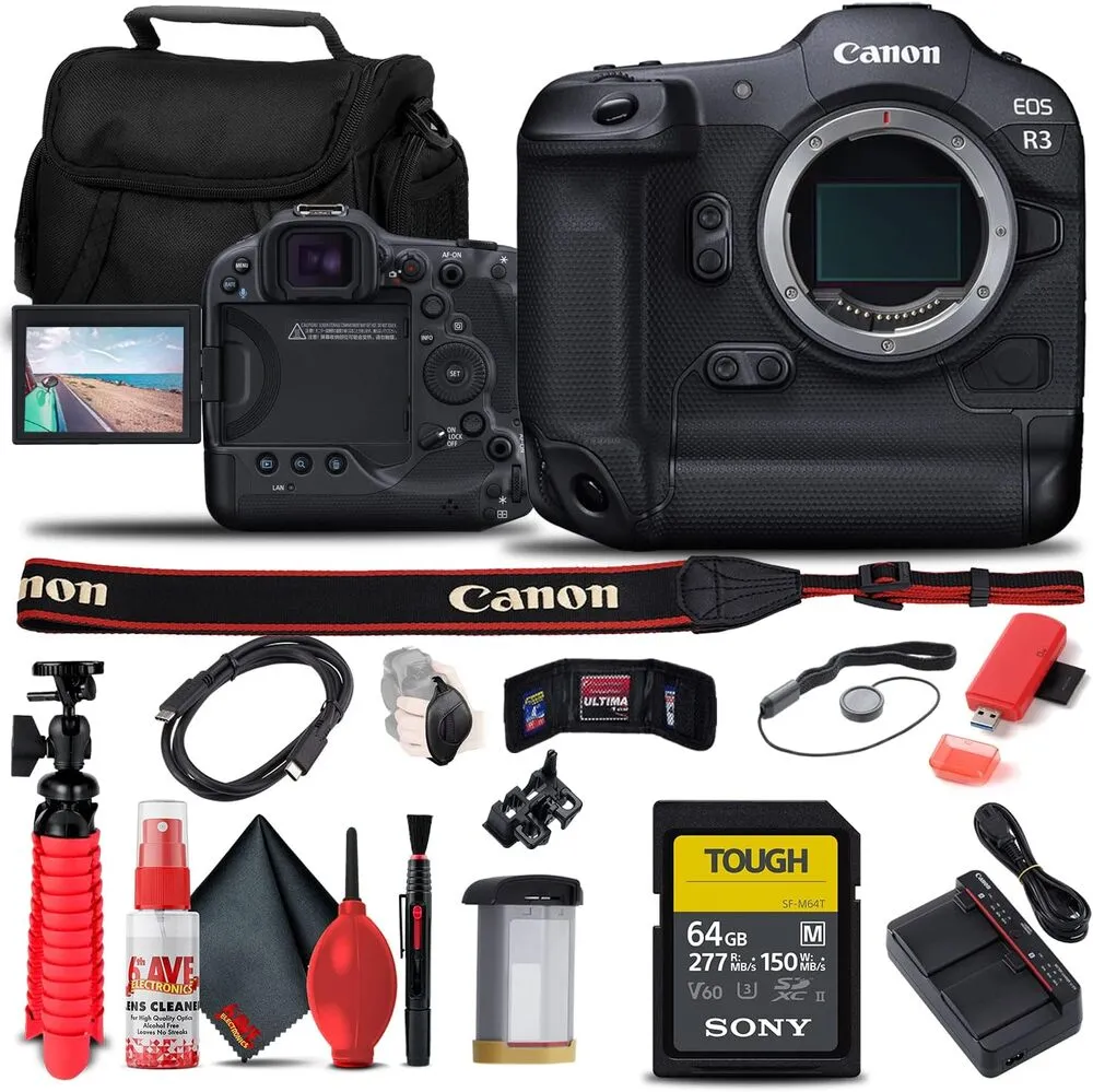 The Canon EOS R3 is a high-performance mirrorless camera designed for professional use, featuring a 24.1-megapixel full-frame stacked CMOS sensor with integrated autofocus pixels. It supports an ISO range of 100-102400, expandable to 50-204800, enabling exceptional low-light performance. The camera incorporates a new Digic X image processor, delivering fast processing speeds and advanced image quality. It offers outstanding autofocus capabilities with eye, face, head, and vehicle tracking powered by AI technology. The EOS R3 supports high-speed continuous shooting at up to 30 frames per second with an electronic shutter. It also includes 6K video recording, making it a versatile tool for both still photography and videography. The robust magnesium alloy body is weather-sealed, ensuring durability in challenging shooting environments.