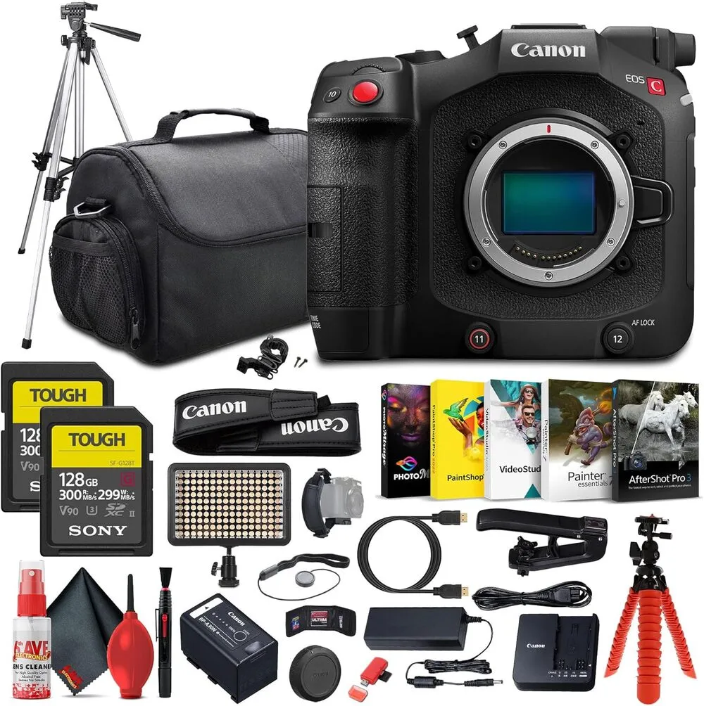 Compatible accessories include Canon battery packs, external microphones, viewfinders, and various mounting rigs designed for the EOS cinema line.