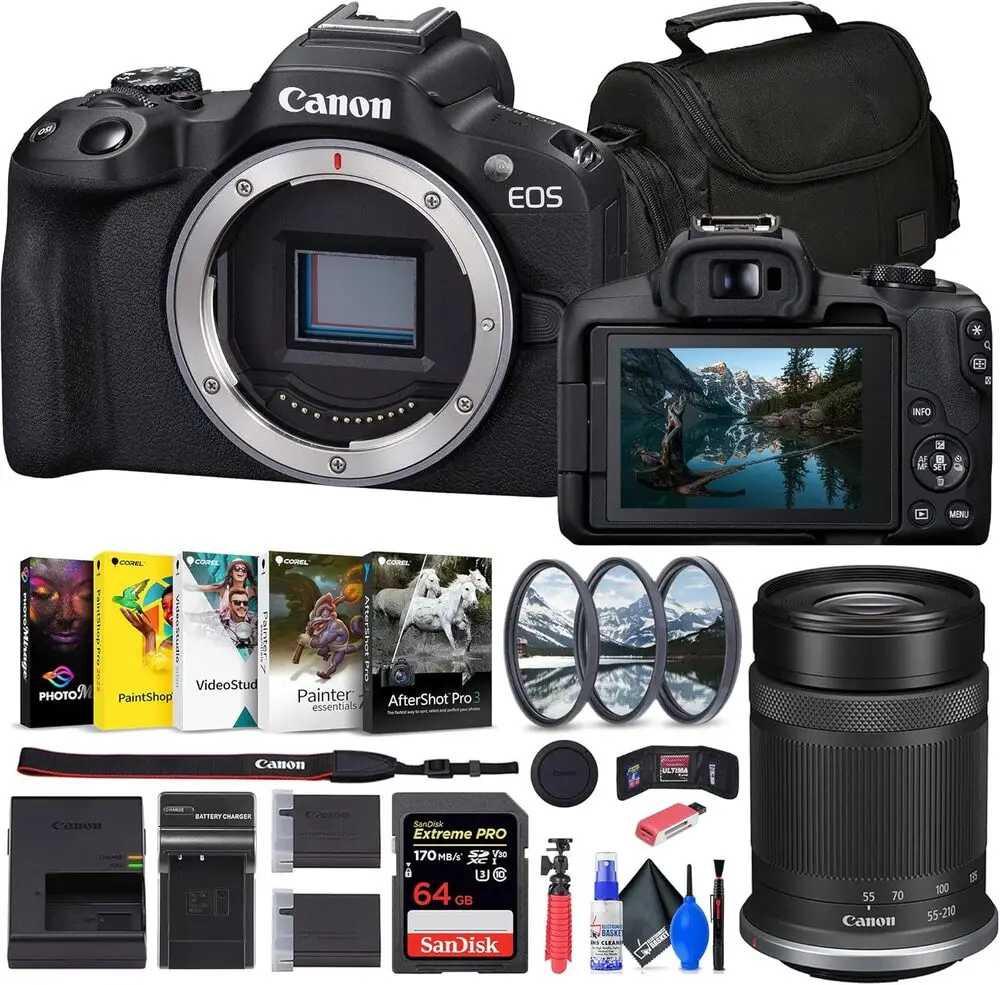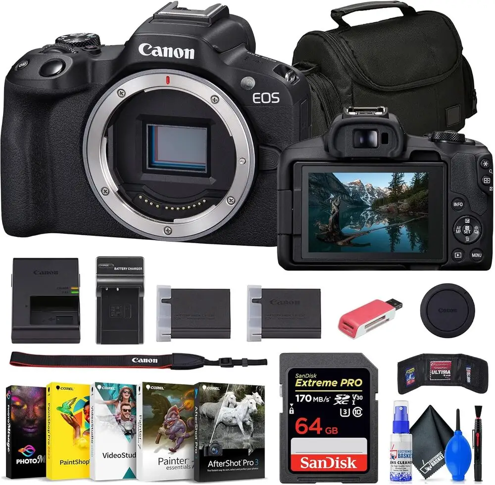 The Canon EOS R50 is a compact mirrorless camera featuring the latest DIGIC X image processor for fast and efficient image handling. It houses a 24.2-megapixel APS-C CMOS sensor that delivers high-resolution images with excellent detail and low noise performance. The camera supports Dual Pixel CMOS AF technology, ensuring precise and fast autofocus in both still and video modes. It offers 4K UHD video recording capabilities at 30fps, suitable for high-quality content creation. The EOS R50 includes a vari-angle touchscreen LCD for flexible shooting angles and enhanced user interface control. Connectivity options like Wi-Fi and Bluetooth enable seamless sharing and remote control via compatible devices.