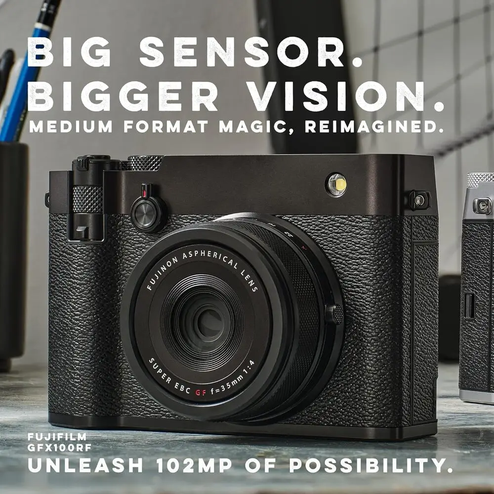 The Fujifilm GFX100RF is a high-resolution medium format mirrorless camera, featuring a 102-megapixel 43.8x32.9mm CMOS sensor which delivers exceptional image quality with superior detail and dynamic range.