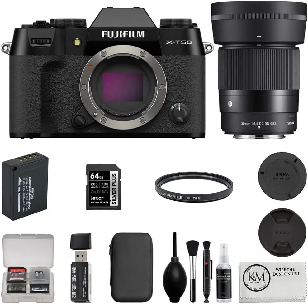 The Fujifilm X-T50 Black boasts a high-resolution APS-C sensor with advanced color science that produces vivid and true-to-life images. Its hybrid autofocus system provides fast and reliable focusing performance across diverse shooting situations. 4K video recording capability expands creative potential for cinematographers and content creators. The vari-angle touchscreen allows intuitive menu navigation and easy framing from challenging angles. Film simulation modes offer unique aesthetic options without post-processing. Lightweight and compact design enable easy handling and transport, making it ideal for travel and street photography.