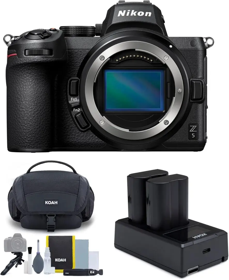 The Nikon Z 5 is a full-frame mirrorless camera equipped with a 24.3-megapixel CMOS sensor, offering excellent image quality and dynamic range. It features the Nikon Z mount, which supports a broad range of Nikkor Z lenses ensuring versatility in shooting. The camera utilizes a hybrid autofocus system with 273 focus points for precise subject tracking and fast focusing. It supports a native ISO range from 100 to 51200 for flexible shooting in various lighting conditions. Video recording capabilities include 4K UHD at 30fps and Full HD at 60fps, enabling high-quality cinematic footage. The body incorporates 5-axis in-body image stabilization to reduce camera shake and produce sharper images and smoother video.