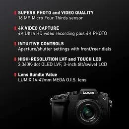 The Panasonic LUMIX G70, also known as DMC-G7 or G7, is a mirrorless digital camera featuring a Micro Four Thirds sensor with a 16-megapixel resolution, offering high-quality imaging with a compact system body. It incorporates a 4K video recording capability at 30fps, making it appealing for both photographers and videographers seeking high-resolution output. The camera is equipped with a fast contrast AF (Autofocus) system supported by Depth from Defocus (DFD) technology, improving focusing speed and accuracy in various shooting environments. It includes an OLED electronic viewfinder with 2.36 million dots, providing a clear and detailed preview for precise composition. The LUMIX G7 supports a fully articulating 3-inch touchscreen LCD, facilitating flexible shooting angles and intuitive control. Connectivity options include Wi-Fi for remote operation and easy content sharing, alongside a microphone input for enhanced audio during video recording.