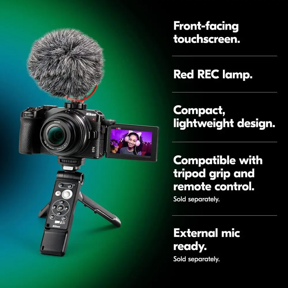 The Nikon Z30 is a compact mirrorless camera designed for content creators and vloggers, introduced in 2022. It features a 20.9-megapixel APS-C (DX) CMOS sensor that delivers high-resolution still images with excellent detail and color fidelity. The camera uses the Nikon Z mount, allowing compatibility with a wide range of high-quality NIKKOR Z lenses. It offers 4K UHD video recording at up to 30fps without a crop, and Full HD at up to 120fps for smooth slow-motion footage. The autofocus system is enhanced with hybrid phase-detection and contrast-detection AF, offering quick and accurate focusing performance. The camera is designed with a vari-angle touchscreen LCD, making it versatile and user-friendly for selfie and vlogging purposes.