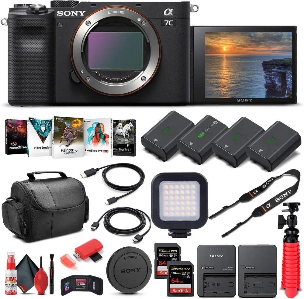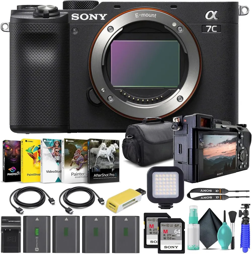 The Sony a7C (model number ILCE7C/B) is a compact full-frame mirrorless camera that combines high-resolution imaging with a lightweight design. It features a 24.2-megapixel Exmor R CMOS sensor, ensuring excellent image quality and low-light performance. Utilizing Sony's BIONZ X image processor, this camera delivers fast processing speeds and enhanced autofocus capabilities with 693 phase-detection AF points and 425 contrast-detection points. The a7C supports real-time Eye AF for both humans and animals, improving precision and ease of use in dynamic shooting conditions. It records 4K UHD video with full pixel readout and no pixel binning, providing detailed and smooth footage. The camera's compact body houses a vari-angle LCD touchscreen, an OLED electronic viewfinder, and built-in Wi-Fi and Bluetooth connectivity for seamless sharing and remote control.